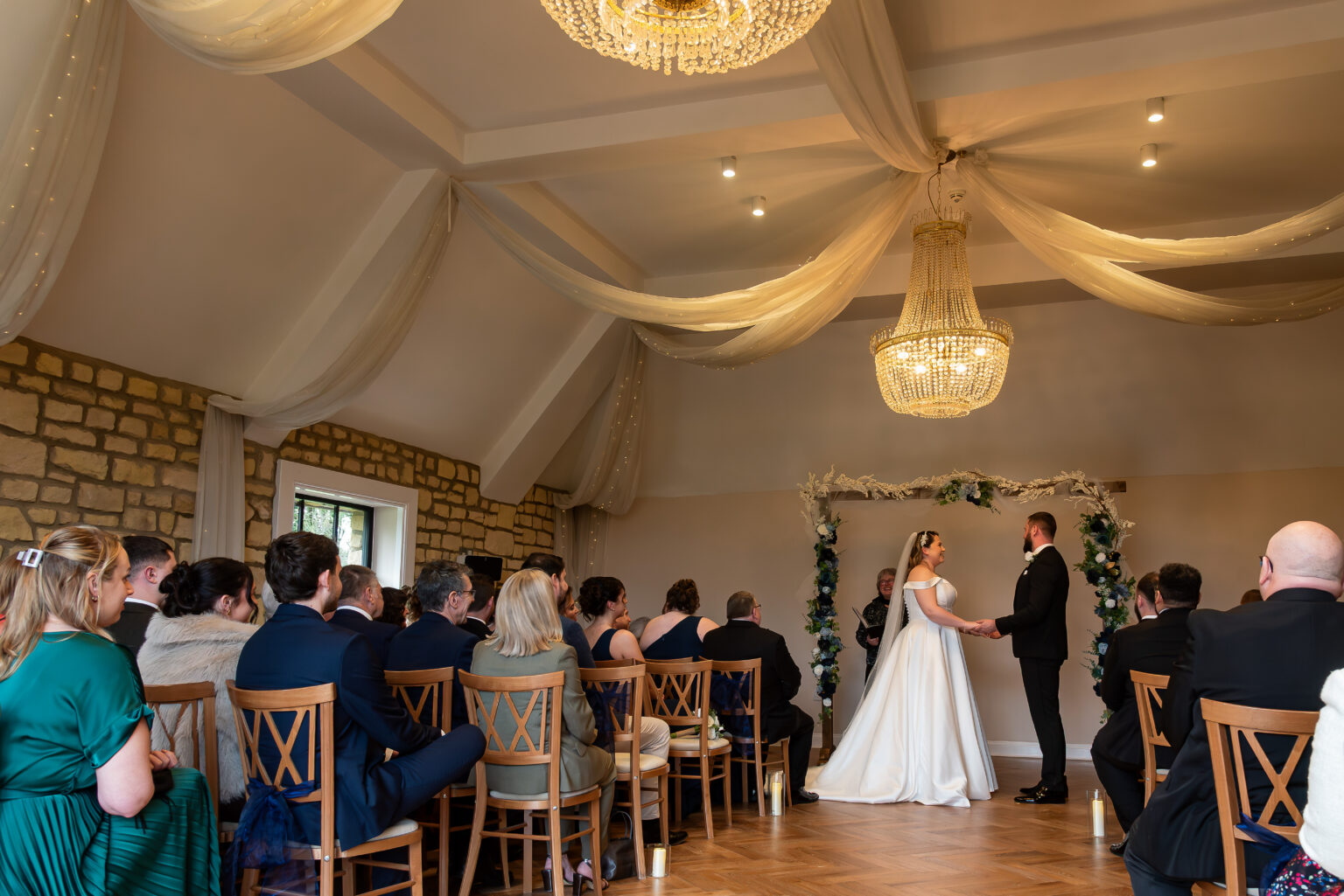 The ceremony room has a beautiful warm undertone thanks to the lovely wooden flooring and off-white walls. The huge windows let in so much light and even on dull days, the beautiful chandeliers are such an important feature, not only decoratively but to create just the right lighting.